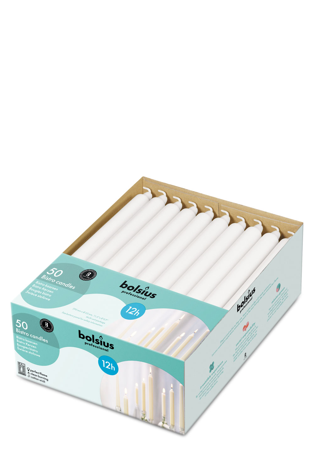 50 Tafelkerzen von Bolsius in der Größe 29x2,2cm in der Farbe weiß.