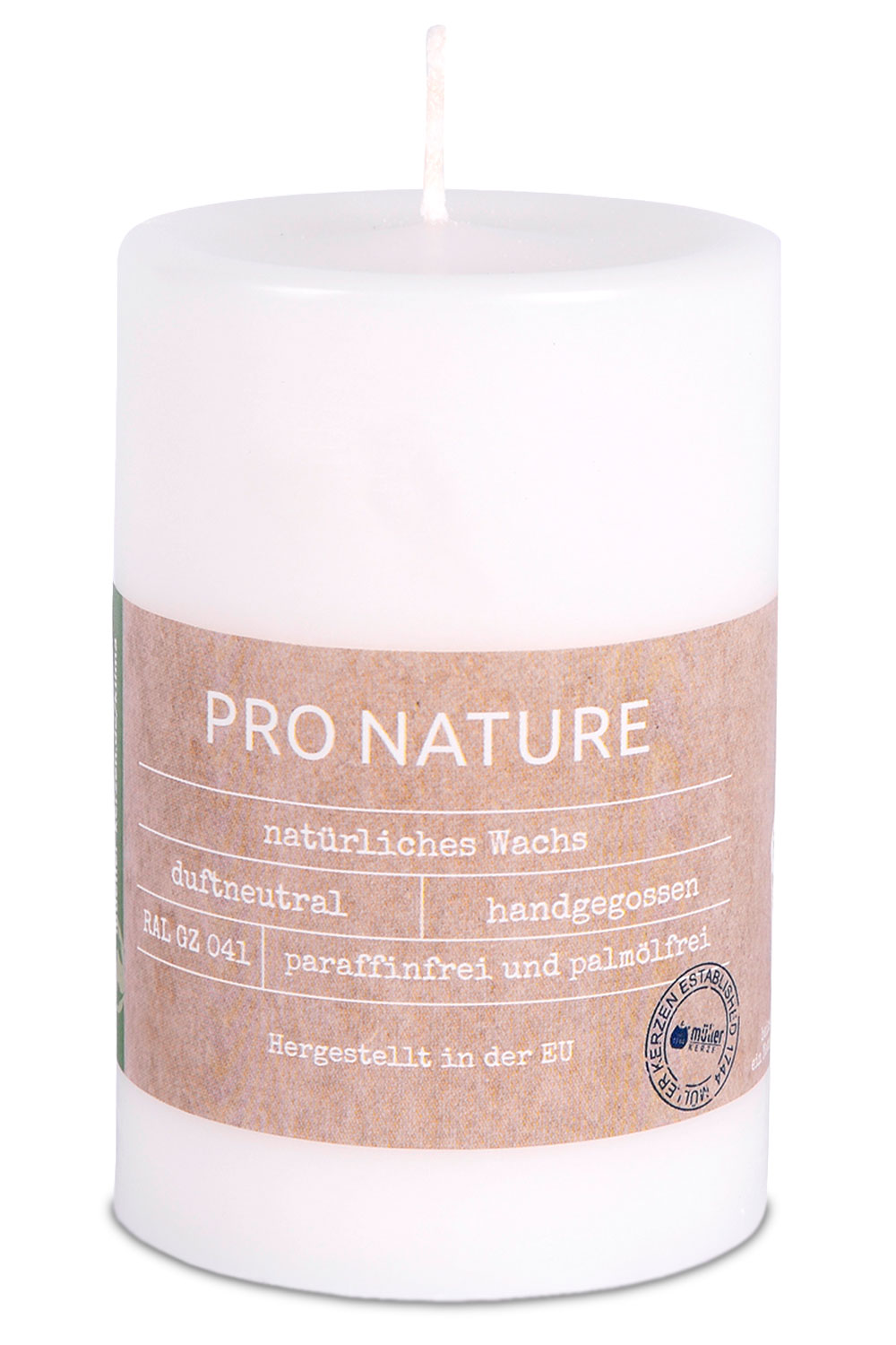Eine Pro Nature Stearin-Stumpenkerze von Müller Kerzenfabrik in der Größe 10x6,8cm in der Farbe weiß.